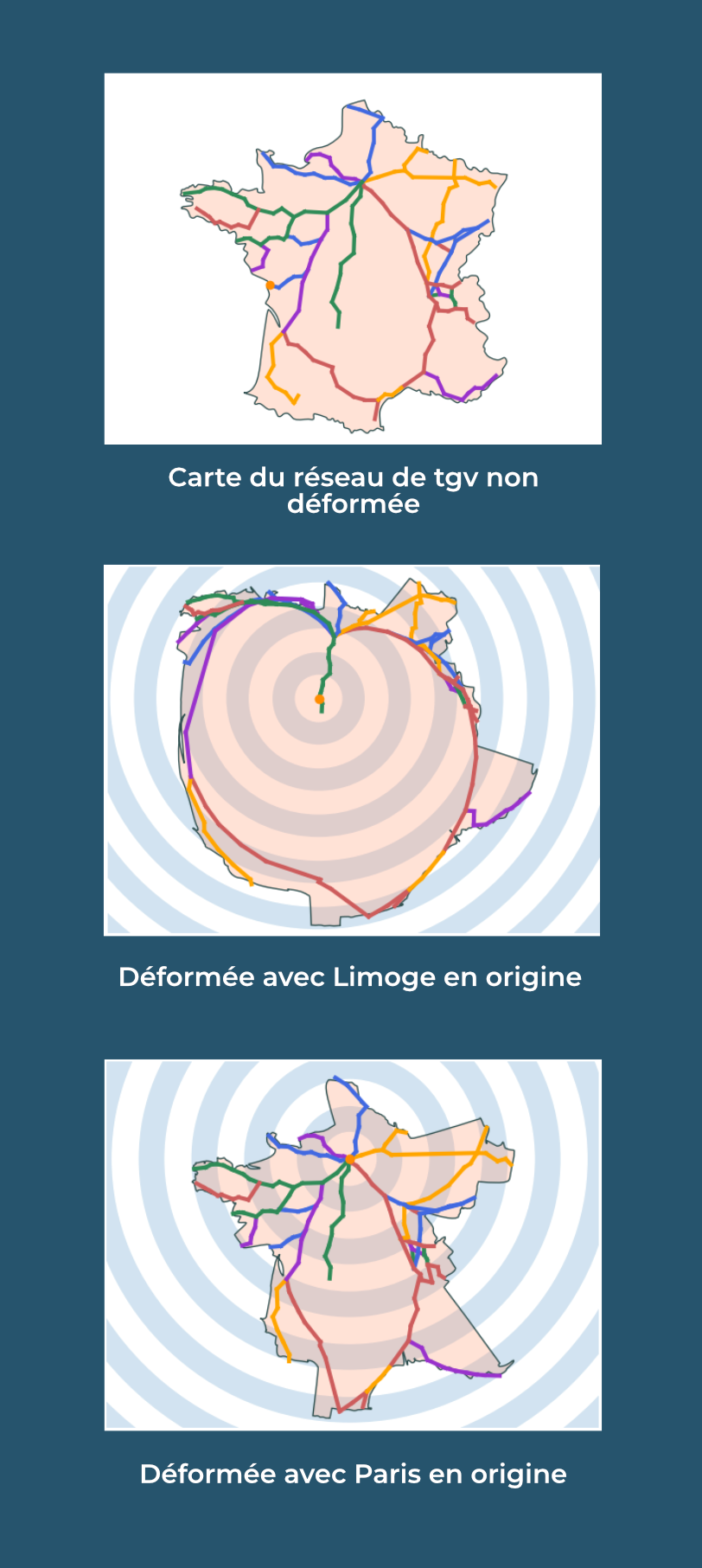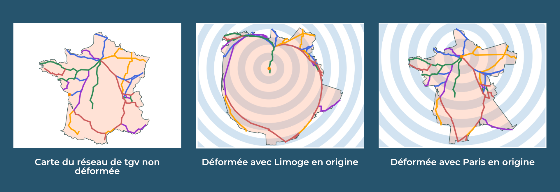 Carte anamorphique interactive pouvant représenter et déformer tout type de réseaux (ici de tgv) en fonction du temps de parcours de celui-ci en partant d'une origine.