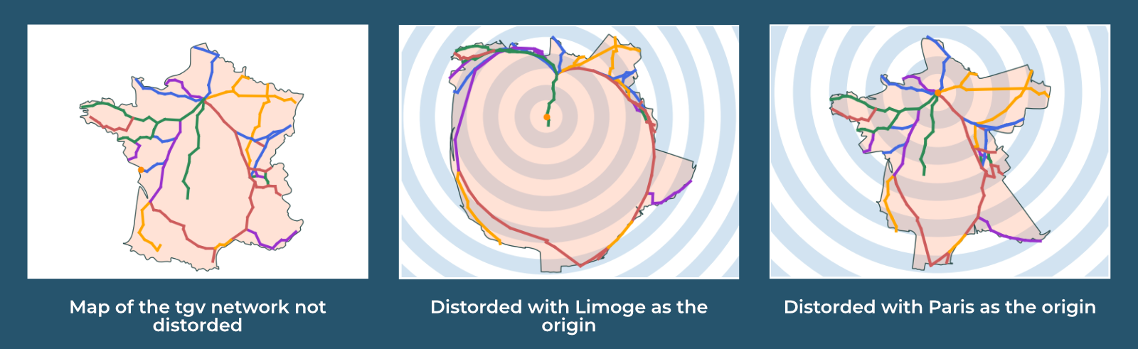 Anamorphic interactive map that can represent and distord all kinds of network (here the french tgv network) according to the time needed to reach each point from an origin.